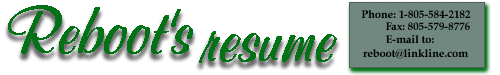 I use Adobe Photoshop, Freehand 7, Micrographics Suite 2, Microsoft 97/98 graphic software. I am very Creative and continuously promote new and intensely original Graphic design concepts. A small list of Index/Front/Home pages.http://www.linkline.com/personal/reboot/reboots_sites.html Some are graphic examples only and links will not Go to existing html pages. Thank you.